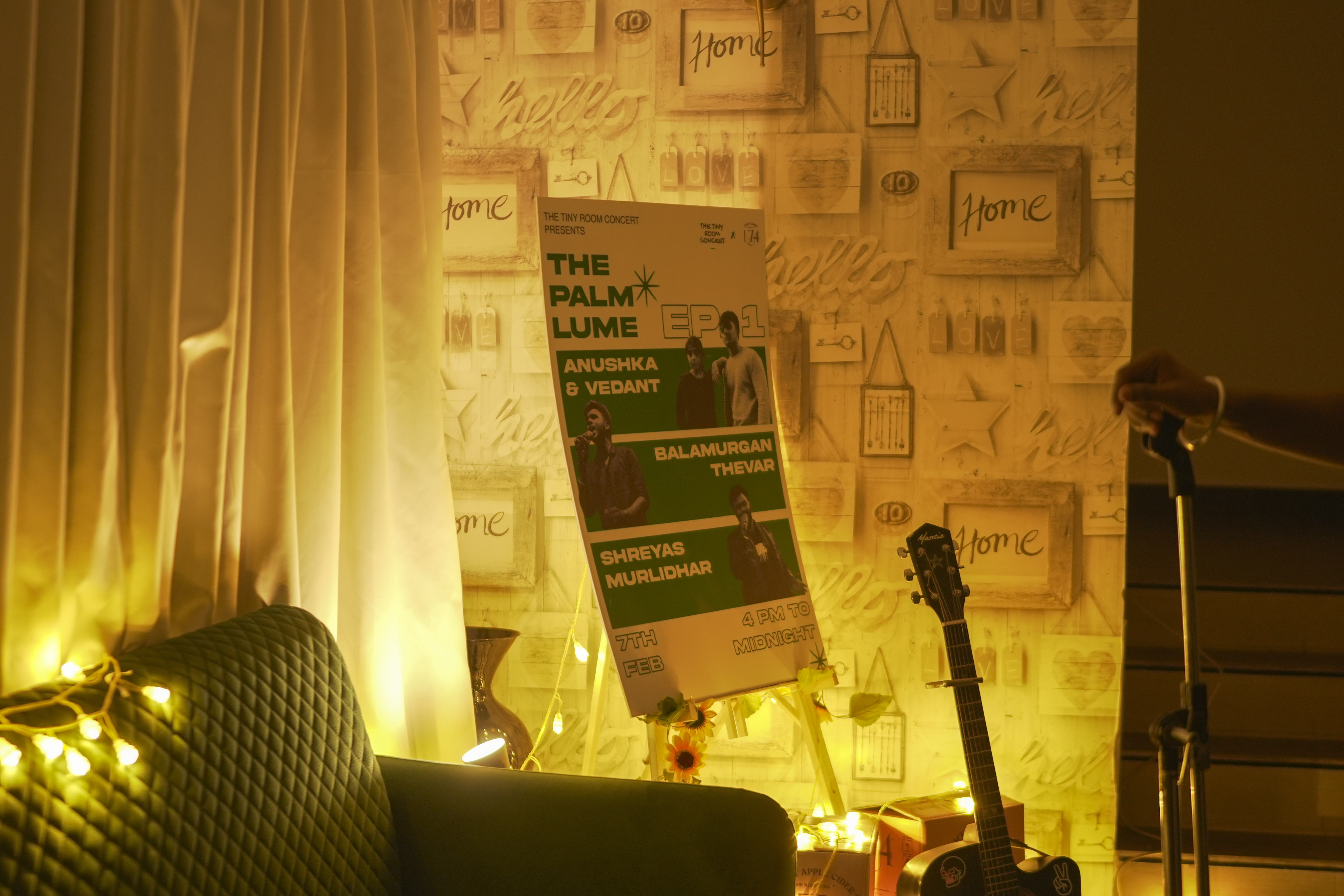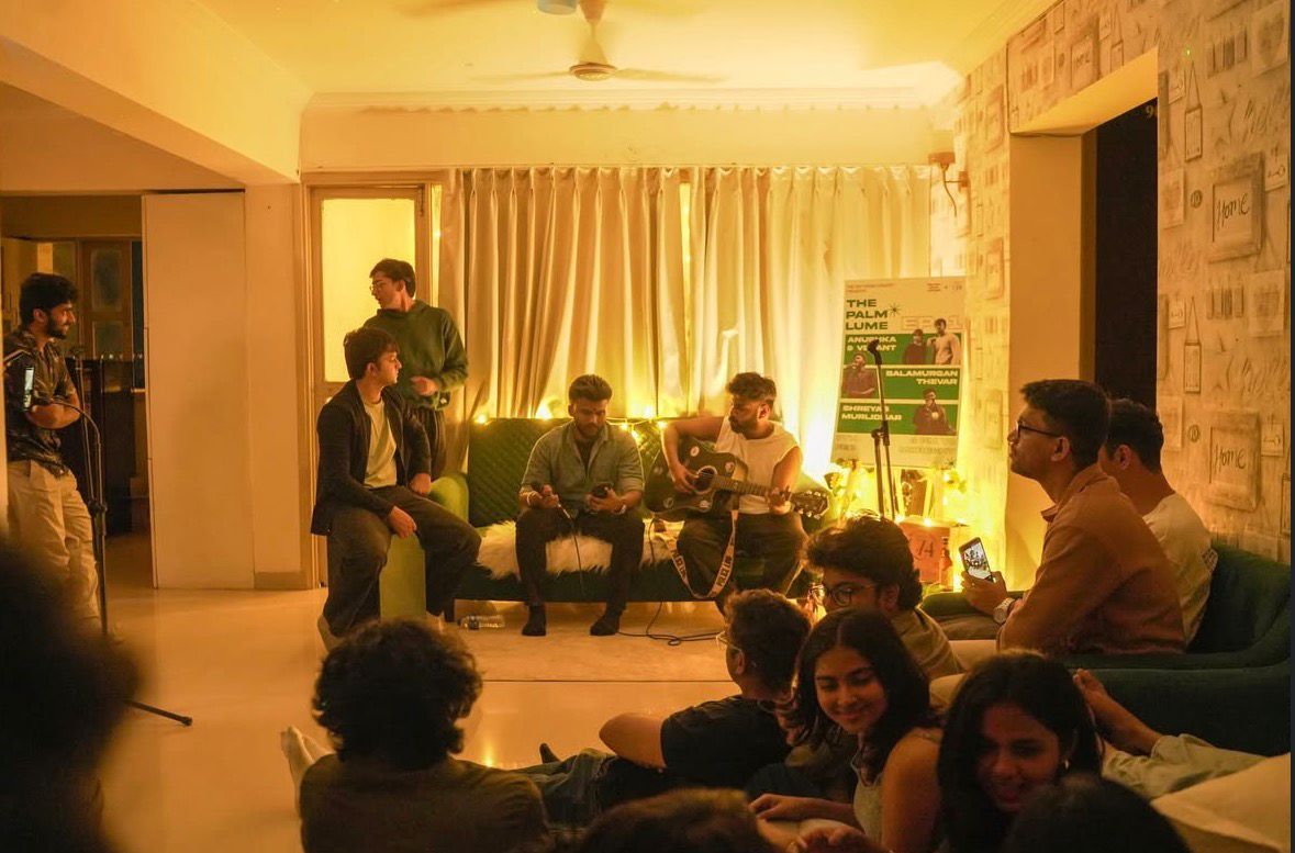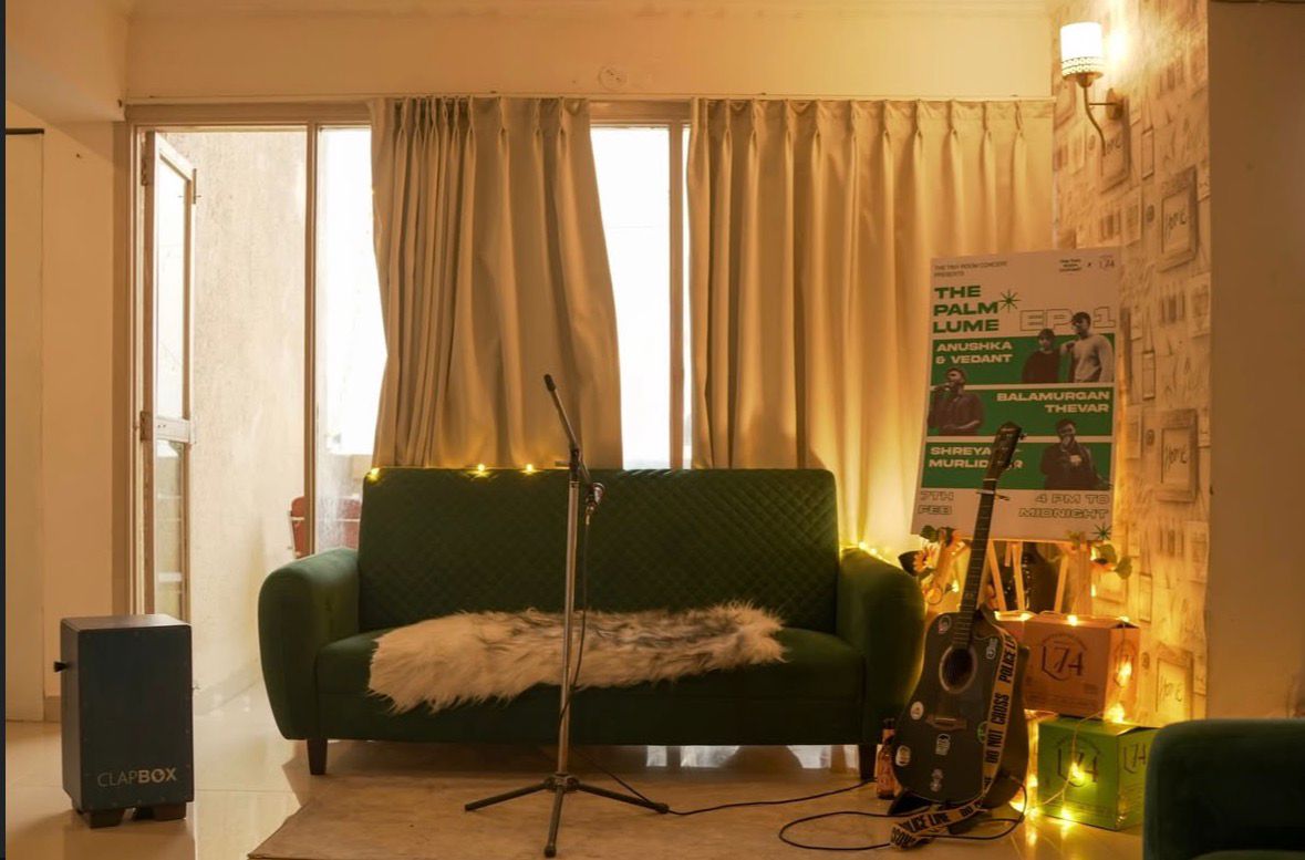 A tiny living room turned concert space.
